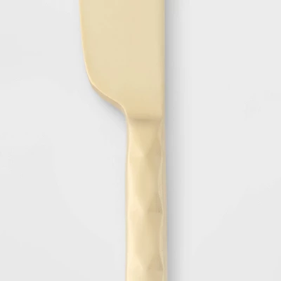 Impress your guests with the opulent look of this 20-Piece Stainless Steel Cherryfield Silverware Set from Thresholdâ˘. This gold-tone silverware set comes with service for four, including four each of dinner forks, salad forks, knives, dinner spoons and teaspoons, to meet all your serving needs for family gatherings or hosting a dinner party. These stainless steel utensils have a textured design and bright hue that will add visual interest to any table setting.
