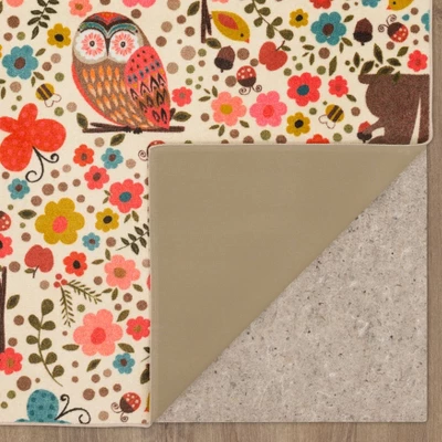 Friendly foxes, owls, squirrels, ladybugs, butterflies, birds and bumble bees play alongside fresh florals in the whimsical multicolored design of Mohawk Homes Enchanted Forest Area Rug. Available in 5×8, 8×10, and 10×14, this area rug is ideal for kids spaces, bedrooms, nurseries, playrooms, classrooms and more. Reenergize your space with radiant color and original artwork digitally constructed over a plush canvas of Mohawk Homes exclusive ecofriendly EverStrand, a premium synthetic yarn created from post-consumer recycled plastic bottles. The rugs of the Prismatic Collection prove you dont have to sacrifice style for sustainability. While EverStrand is renowned for its softness, this silky yarn also offers superior strength stain resistance, illustrious fade resistant color clarity and dependable durability ideal for high traffic spaces with kids and pets. Keep your new rug and the flooring beneath looking their best with an essential all-surface, earth conscious rug pad, crafted of 100% recycled fibers and certified Green Label Plus by The Carpet & Rug Institute!