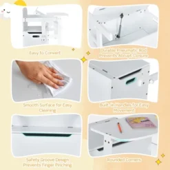 Tired of a toy covered floor? Our kids convertible storage bench is a perfect companion for your growing kids. And the large toy storage space helps to keep your home tidy and clean. This versatile bench with 3-in-1 design can be easily converted from a stool to a desk set, which is ideal for the kids room, kindergarten, art playroom and more. It can be used as a table and chair set for studying, drawing, and eating, or it can be turned into a stool for sitting and changing shoes. In addition, the safety pneumatic rod allows the storage box to open slowly and prevents the lid from shutting suddenly to avoid injury. Besides, the high quality material is stable and can be used for a long time.