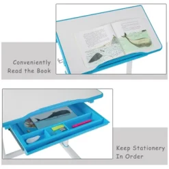 Our multi-functional kids study desk and chair set combines practicality & fun, which is an ideal study companion for your kids. The height of the desk and chair is adjustable in order to have a perfect posture when sitting.Tilted tabletop satisfies different needs of reading, writing or drawing. The organized pull out drawer can maintain stationery with different classifications. Made of premium environmentally friendly materials, this set is sturdy yet safe. The pedestal frames feature anti-slippery floor glides that prevents itself from moving.