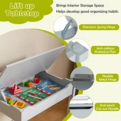 - Lift Top & Interior Storage: The kids art table features a lift-top design with inner storage place for kids’ items. With the premium spring hinge, you are able to stop the tabletop at any desired position. And the anti-pinch cut out handle as well as the anti-collision protective pads ensures safe use.