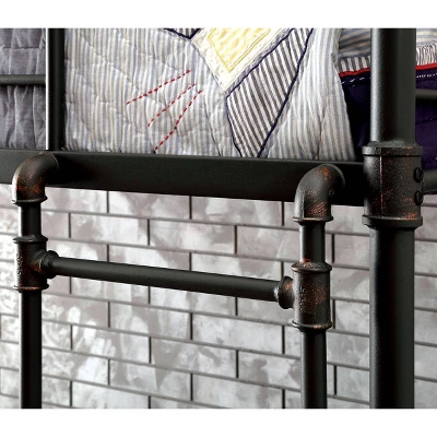 Bring cool style to your kid’s bedroom with the Derrick Kids Bunk Bed from HOMES: Inside + Out. The steel frame shows off an iconic industrial-inspired piping accent for a charming and sophisticated style your kids will love. It is complete with guard rails on the top bunk to help keep them from rolling out of bed in the middle of the night. Sleek rust accents add to the old industrial style of the bunk bed.