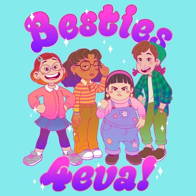 - Featuring graphics of Mei Lee, Abby Park, Miriam Mendelsohn, and Priya Mangal with “Besties 4Eva!” printed around them in bubble letters!