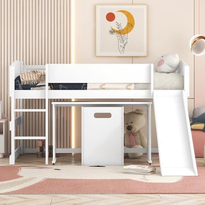 It adopts the loft structure design, enjoys the space below, and comes with a portable desk. When the desk is needed, simply unfold it from under the loft for more work space for your family to play and let their imaginations run wild. A built-in 2-stage ladder provides easy access to the bed with a full-length safety rail.