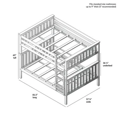 Plenty of room for sleep and play? Now thatās a win-win! The Max & Lily Full Over Full Bunk Bed is the perfect combination of functional and fun that both kids and parents love. Top bunk features tall 14ā guardrails, so the bed safely fits standard mattress sizes. Angled ladder with rounded edges offers comfortable, easy climbing. Added bonus – ladder is both reversible and removable, so it is flexible to work with any space. Solid, knot-free New Zealand pine wood adds strength and stability. All Max & Lily products use a durable, low VOC finish. The slatted head and footboards and flush, color-matched hardware give this bunk bed a clean, modern look. Instructions, upper/lower slat rolls, and required hardware are included. With solid plywood slats and a metal support bar for the top bunk, each sleeping surface can support 400 pounds of resting weight. This bed meets or exceeds Federal safety standards for kids furniture. When itās time for play, this bunk bedās space saving design frees up plenty of floor space by stacking two sleeping surfaces. Add storage drawers or trundle to make this bed even more functional. 2+ adults make assembly simple and easy. The Full Over Full Bunk Bed from Max & Lily offers exceptional quality and affordability that kids and their parents will enjoy for years to come. Max & Lily is a member of the Maxwood family of brands – the kids furniture experts bringing a tradition of superior quality, safety and fun!