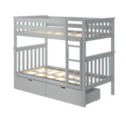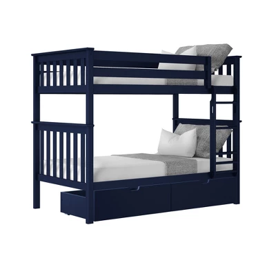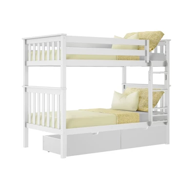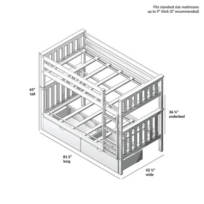Plenty of room for sleep and play? Now thatās a win-win! The Max & Lily Twin Over Twin Bunk Bed with Under Bed Storage Drawers is the perfect combination of functional and fun that both kids and parents love. Top bunk features tall 14ā guardrails, so the bed safely fits standard mattress sizes. Added under bed storage drawers make organizing a breeze. Angled ladder with rounded edges offers comfortable, easy climbing. Added bonus – ladder is both reversible and removable, so it is flexible to work with any space. Solid, knot-free New Zealand pine wood adds strength and stability. All Max & Lily products use a durable, low VOC finish. The slatted head and footboards and flush, color-matched hardware give this bunk bed a clean, modern look. Instructions, upper/lower slat rolls, and required hardware are included. With solid plywood slats and a metal support bar for the top bunk, each sleeping surface can support 400 pounds of resting weight. This bed meets or exceeds Federal safety standards for kids furniture. When itās time for play, this bunk bedās space saving design frees up plenty of floor space by stacking two sleeping surfaces. 2+ adults make assembly simple and easy. The Twin Over Twin Bunk Bed with Under Bed Storage Drawers from Max & Lily offers exceptional quality and affordability that kids and their parents will enjoy for years to come. Max & Lily is a member of the Maxwood family of brands – the kids furniture experts bringing a tradition of superior quality, safety and fun!