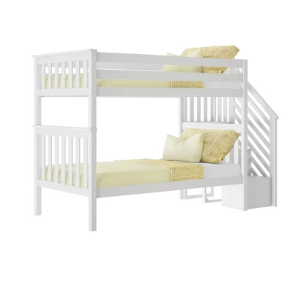 Plenty of room for sleep and play? Now thatās a win-win! The Max & Lily Twin Over Twin Bunk Bed with Staircase is the perfect combination of functional and fun that both kids and parents love. Top bunk features tall 14ā guardrails, so the bed safely fits standard mattress sizes. Staircase with rounded edges offers comfortable, easy climbing. Added bonus – staircase is both reversible and removable, so it is flexible to work with any space. Solid, knot-free New Zealand pine wood adds strength and stability. All Max & Lily products use a durable, VOC finish. The slatted head and footboards and flush, color-matched hardware give this bunk bed a clean, modern look. Instructions, upper/lower slat rolls, and required hardware are included. With solid plywood slats and a metal support bar for the top bunk, each sleeping surface can support 400 pounds of resting weight. This bed meets or exceeds Federal safety standards for kids furniture. When itās time for play, this bunk bedās space saving design frees up plenty of floor space by stacking two sleeping surfaces. Add storage drawers or trundle to make this bed even more functional. 2+ adults make assembly simple and easy. The Twin Over Twin Bunk Bed with Staircase from Max & Lily offers exceptional quality and affordability that kids and their parents will enjoy for years to come. Max & Lily is a member of the Maxwood family of brands – the kids furniture experts bringing a tradition of superior quality, safety and fun!