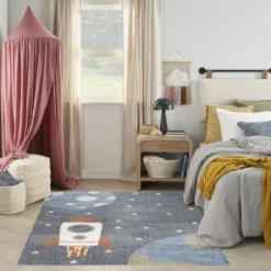 Zoom away to new frontiers with this kids rug from the Astra Machine Washable Collection. A soft multicolored rocket soars through space on a blue background, inspiring dreams and hours of imaginative play in your child’s playroom or bedroom. This machine-washable rug is made from soft, shimmery yarns that shift tones with changing light.