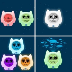 - Your child will learn when to stay in bed or when it is ok to wake with color changing lights and digital owl face expression.